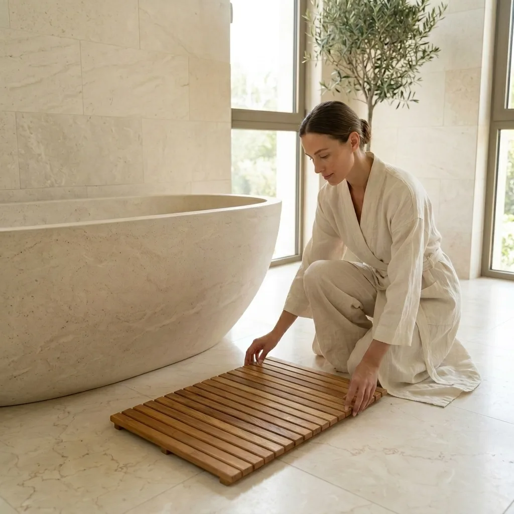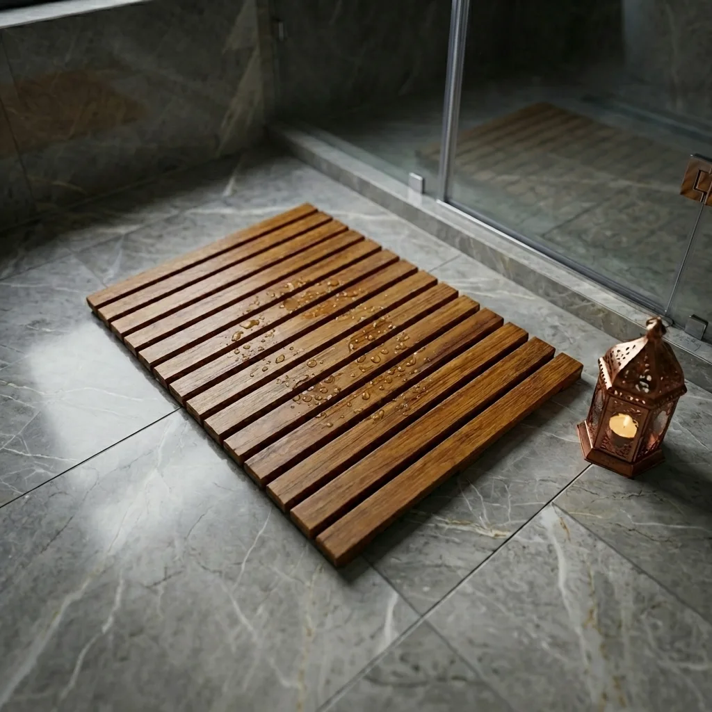 Ahşap kaydırmaz duş matını banyoya yerleştirmeden önce tuzlu suyla silmeniz Teak ağacının gözenek yapısını banyo nemine karşı optimize eder. Bu kadim yöntem malzemenin biyolojik zırhını aktive ederek on yıllarca sürecek bir koruma başlatır.