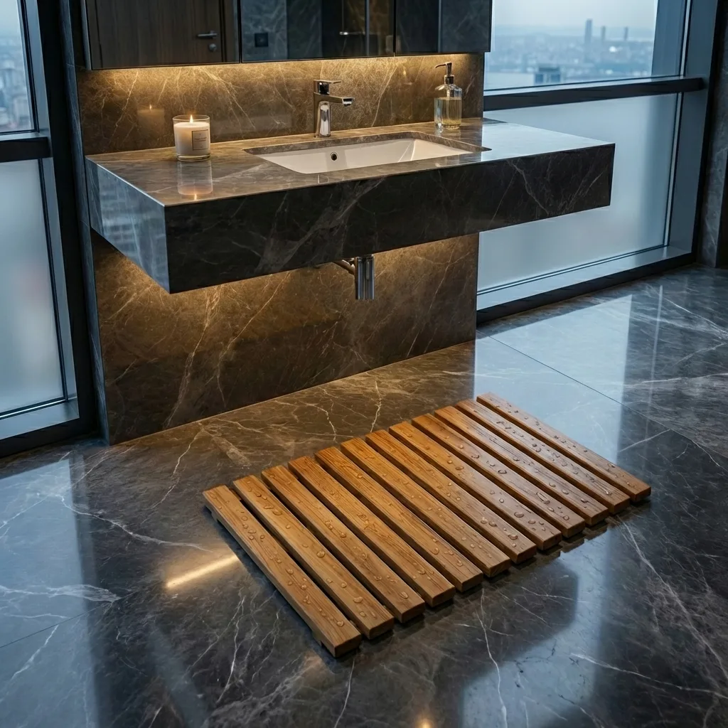 SHAVA serisinin karakteristik paralel lata (ızgara) yapısı görsel bir ritim sunmanın ötesinde teknik bir amaca hizmet eder. 18 mm kalınlığındaki masif çıtalar arasındaki derz boşlukları suyun yüzeyde birikmesini engelleyerek ayağınızın her zaman kuru ve temiz bir dokuyla temas etmesini sağlar. Alt ve üstten hava alan bu aerodinamik yapı nemi hızla tahliye ederek küf ve koku oluşumunu fiziksel olarak durdurur.