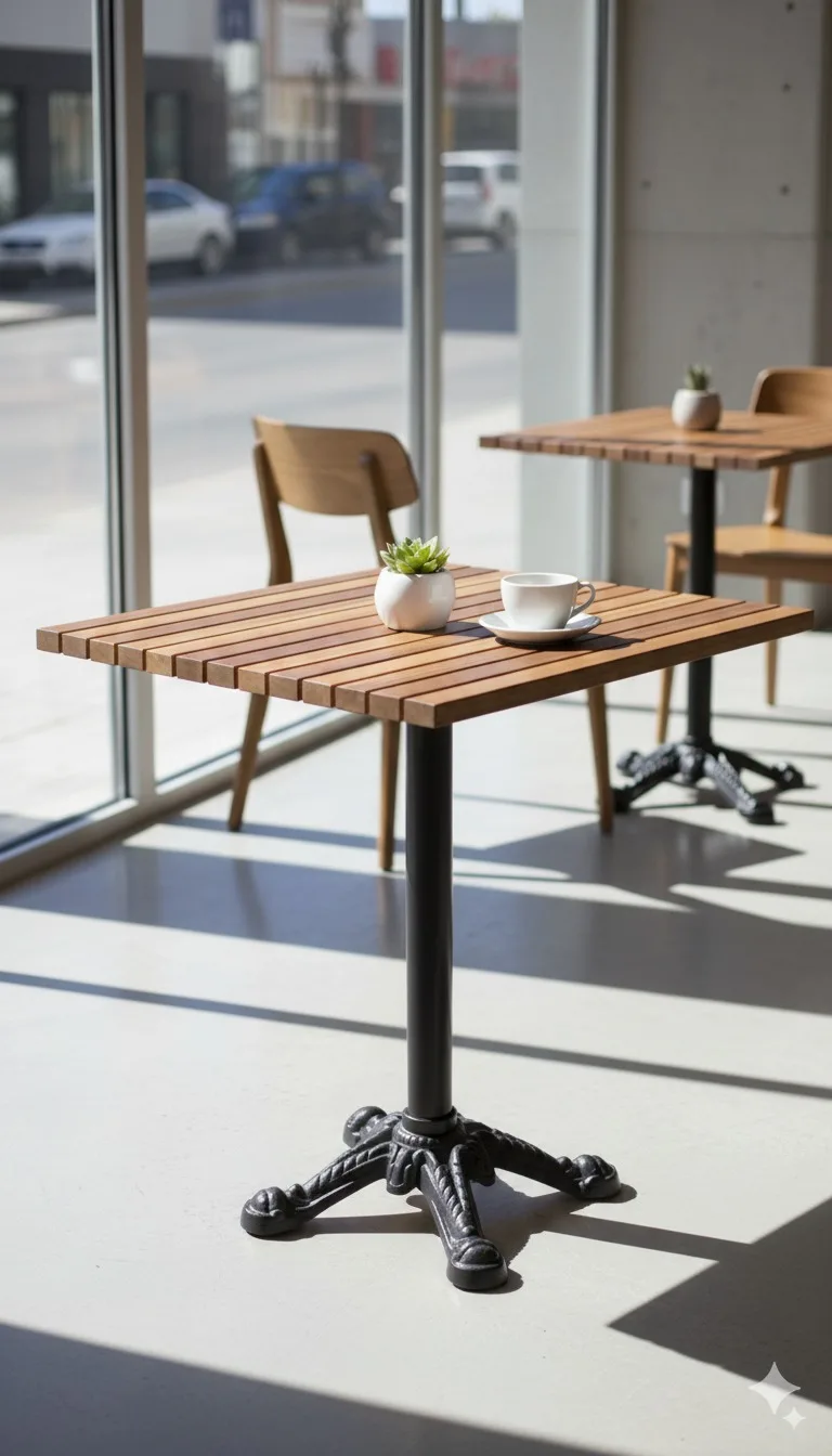 Ayak: Sarsılmaz denge için tasarlanmış, elektrostatik boyalı masif Döküm Demir taban ve çelik profil. Yoğun kullanımlı ticari mekanlar (kafe, restoran) için test edilmiş ve onaylanmıştır.