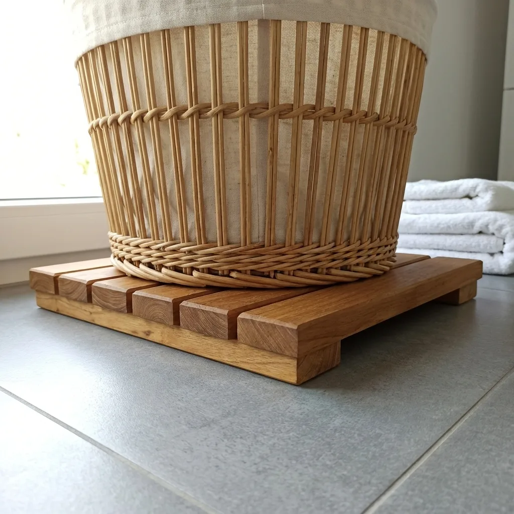 30×30 cm boyutundaki çamaşır sepeti altlığı özellikle alan kısıtı olan banyolarda veya tek kişilik sepetlerde maksimum verimlilik sunar. Alt kısmındaki kaydırmaz pabuçlar ıslak zeminlerde tablanın stabil kalmasını sağlarken ağacın zeminle temasını keserek kuruma sürecini hızlandırır. Zamanla asil bir gümüşi patinaya bürünen yaşayan bir parça ile banyonuz bir SPA alanına dönüşür.